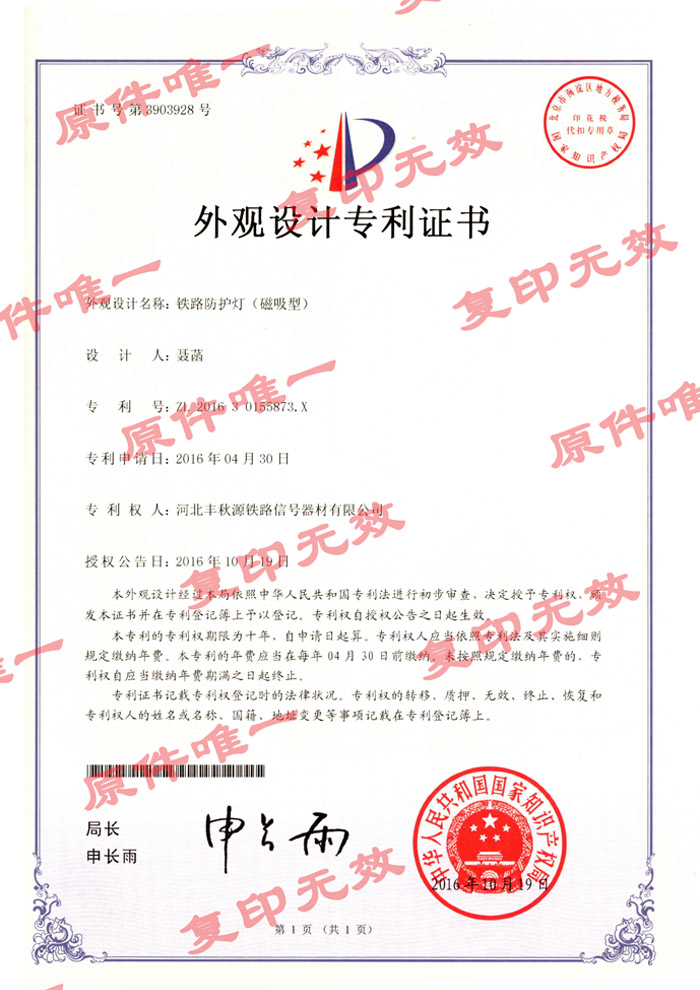 铁路防护灯(磁吸型)外观专利证书